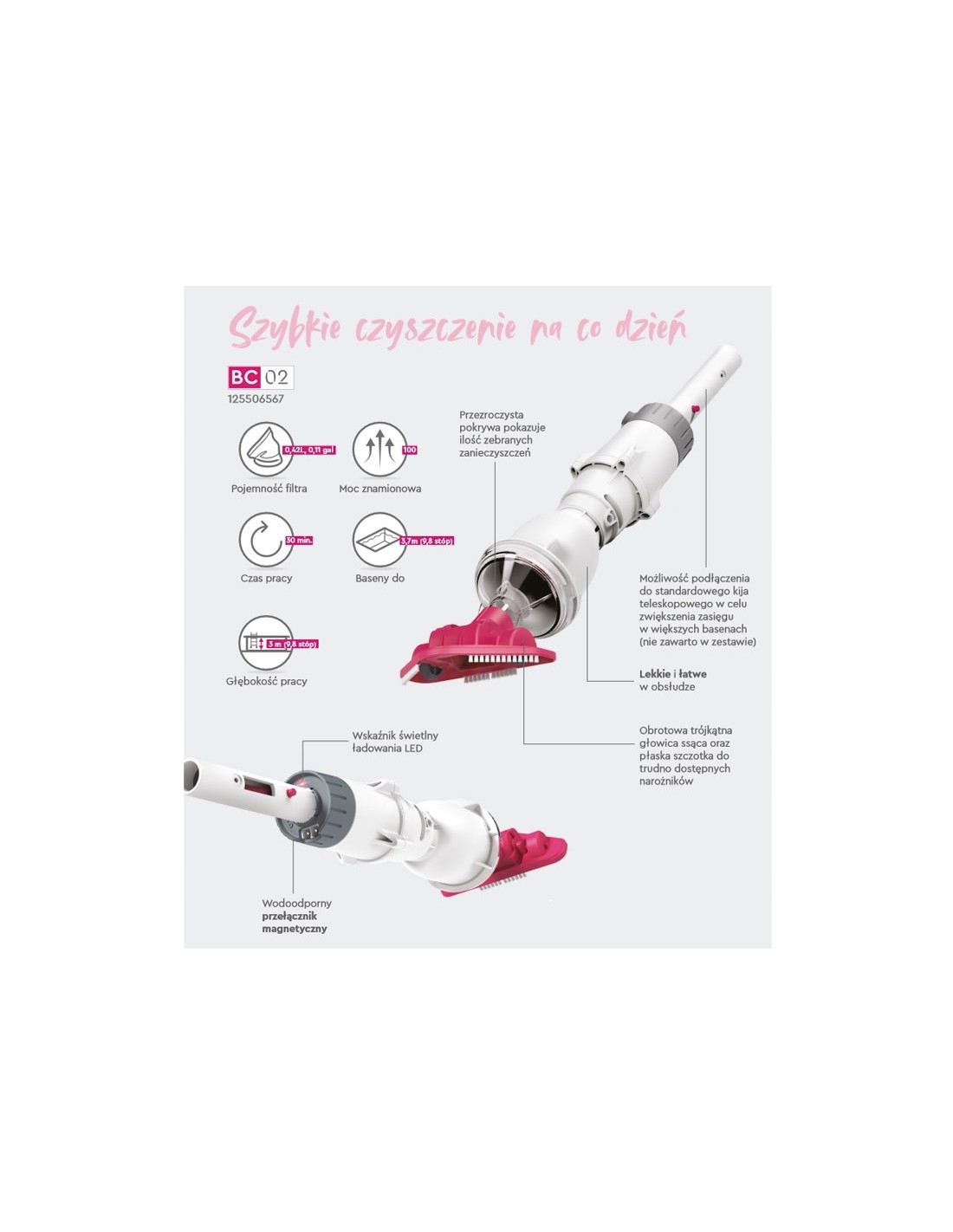 Odkurza zanieczyszczenia z małych basenów i spa o długości do 3,7 m. Przezroczysty korpus do monitorowania napełniania pojemnika na zanieczyszczenia. Lampka kontrolna ładowania LED. Łączy się z kijem teleskopowym (brak w zestawie). Szczotka płaska, obrotowa głowica ssąca. Kabel do ładowania USB. Jeden filtr nylonowy 250 mikronów, łatwy w utrzymaniu. DANE TECHNICZNE: Model: BC 02 Bateria: Akumulator litowo-jonowy 2000 mAh 3,7 V (wymienny) Czas ładowania baterii: 4,5 - 6 godzin Żywotność baterii: 30 minut (przy pełnym naładowaniu) Rodzaj czyszczenia: Ręcznie Pojemność pojemnika ochronnego: 0,42 litra Waga: 0,850 kg Maksymalna głębokość operacyjna : 2m Czyści baseny do : 10 m³ Przeźroczysta komora filtra Komora filtra ma przezroczystą pokrywę, dzięki czemu można sprawdzić, kiedy filtr jest pełny. Filtr o wielkości 250 mikronów, wykonany z miękkiego nylonu ułatwiającego płukanie, ma pojemność 0,42 litra. Szybkość filtracji marki BWT BC02 wynosi 29 litrów na minutę. Pielęgnacja basenu bez kabli Dzięki wydajnemu akumulatorowi litowo-jonowemu możesz czyścić basen nawet przez 30 minut, bez utraty mocy ssania po pełnym naładowaniu. Duża komora na zanieczyszczenia odkurzacza basenowego BWT BC02 o pojemności 0,42 litra oraz wkład filtrujący o drobnych oczkach zapewniają krystalicznie czystą i higieniczną wodę w basenie. Odkurzacz basenowy BWT BC02 posiada rozkładaną sztycę ok 90cm Łatwe czyszczenie za pomocą trójkątnej głowicy Odkurzacz basenowy BWT BC02 nadaje się szczególnie do łatwego i skutecznego czyszczenia podłóg w basenach naziemnych i spa do 10 m³. Dzięki dużej sile ssania i trójkątnej głowicy bardzo łatwo zbierze brud, taki jak trawa, liście, piasek, a nawet małe kamienie. Dodatkowo w zestawie znajduje się również wąska płaska nasadka szczotkowa, aby jeszcze lepiej dotrzeć nawet do trudno dostępnych miejsc w basenie (np. w rejonie drabinki basenowej).